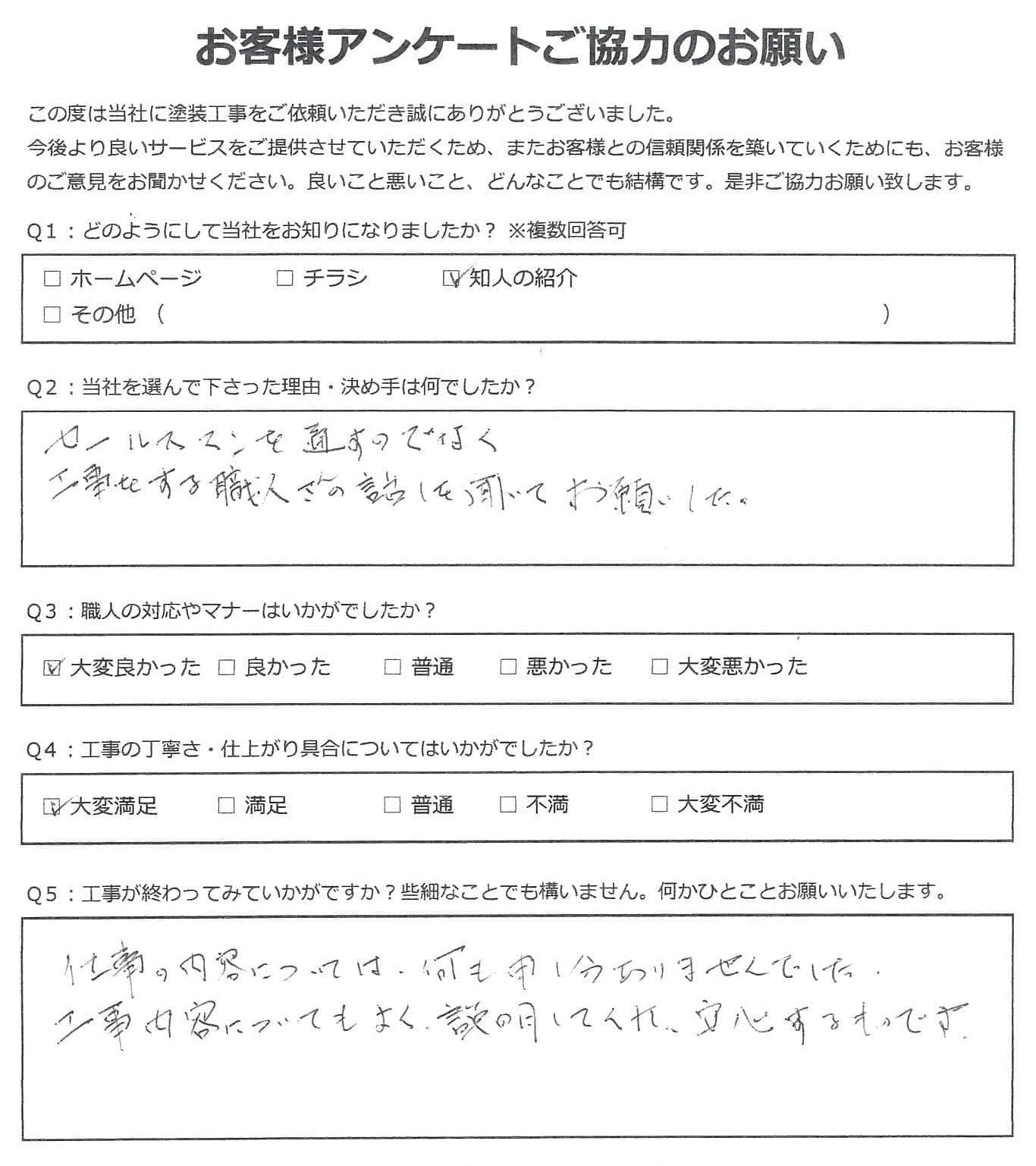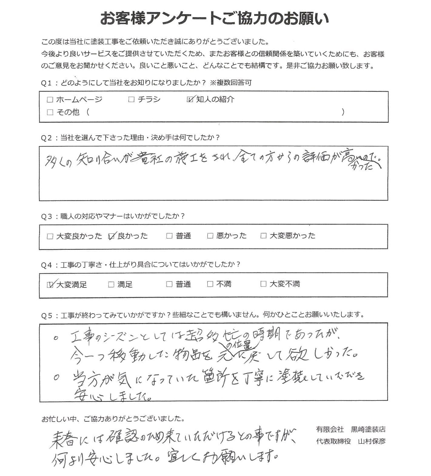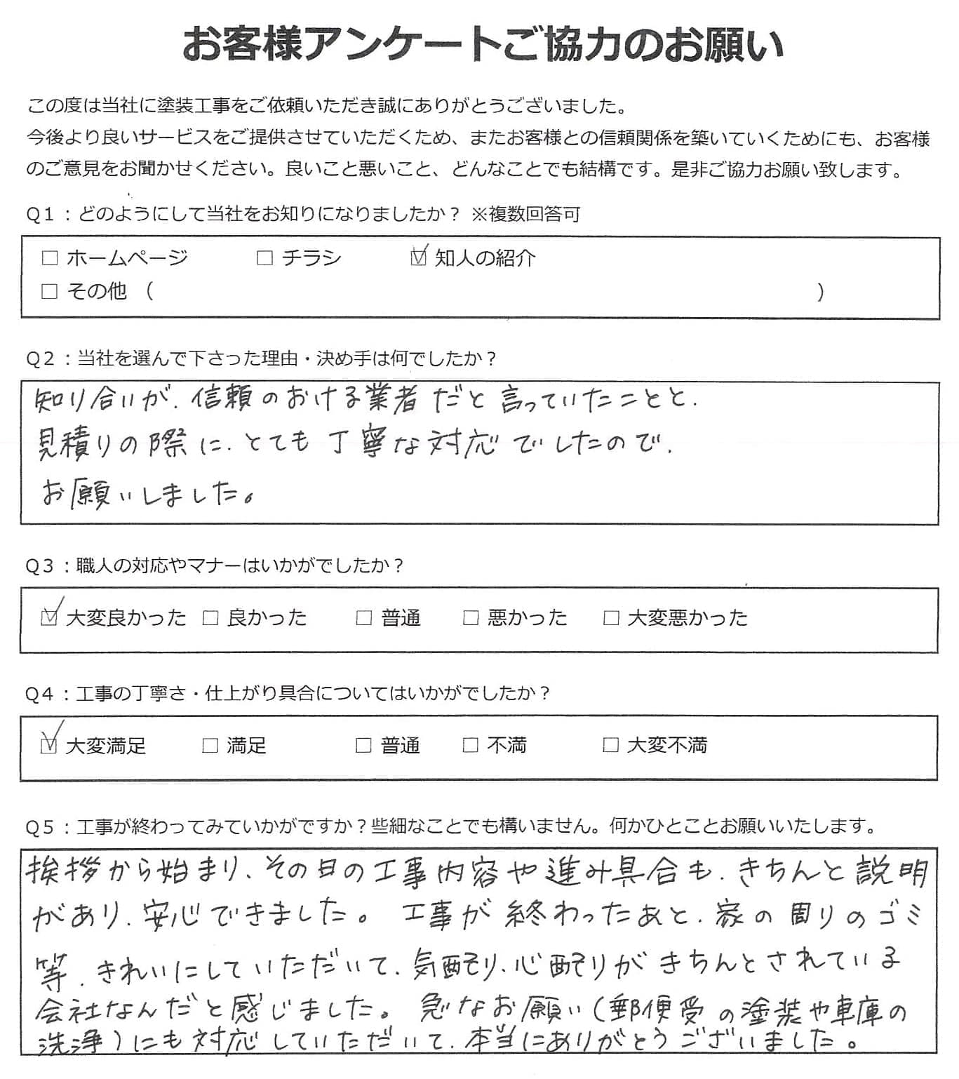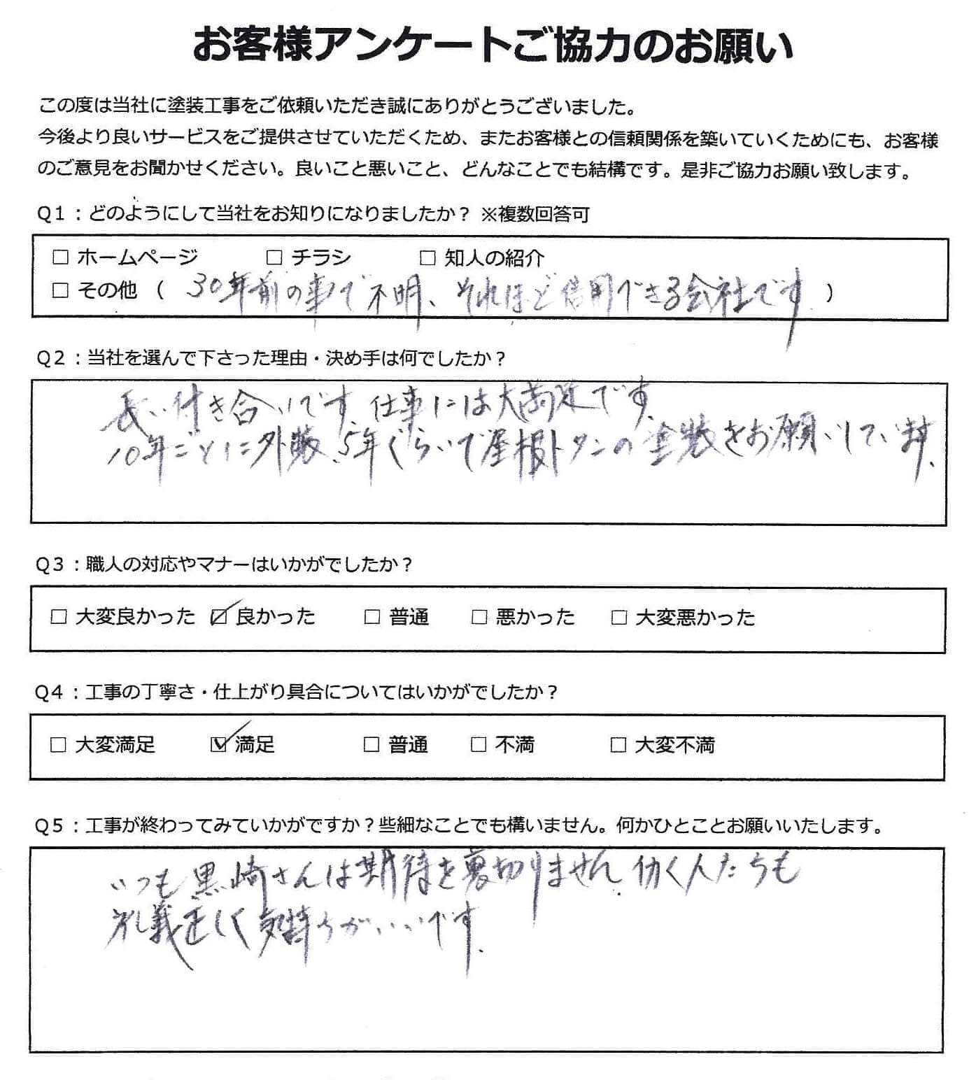 黒崎塗装店では施工後に必ずお客様アンケートを実施しております。 大変満足いただいたというお声から、中にはお叱り、厳しいご指摘など様々なお声をいただいております。