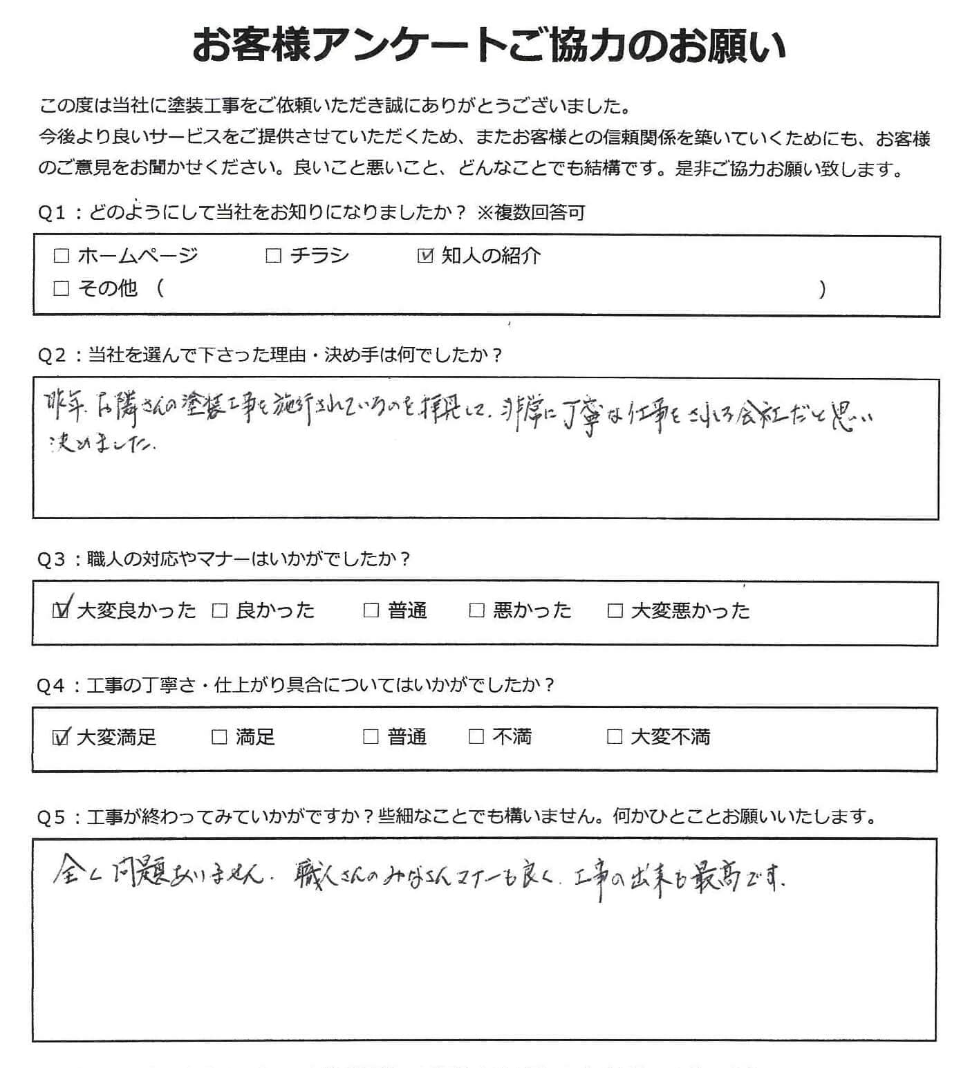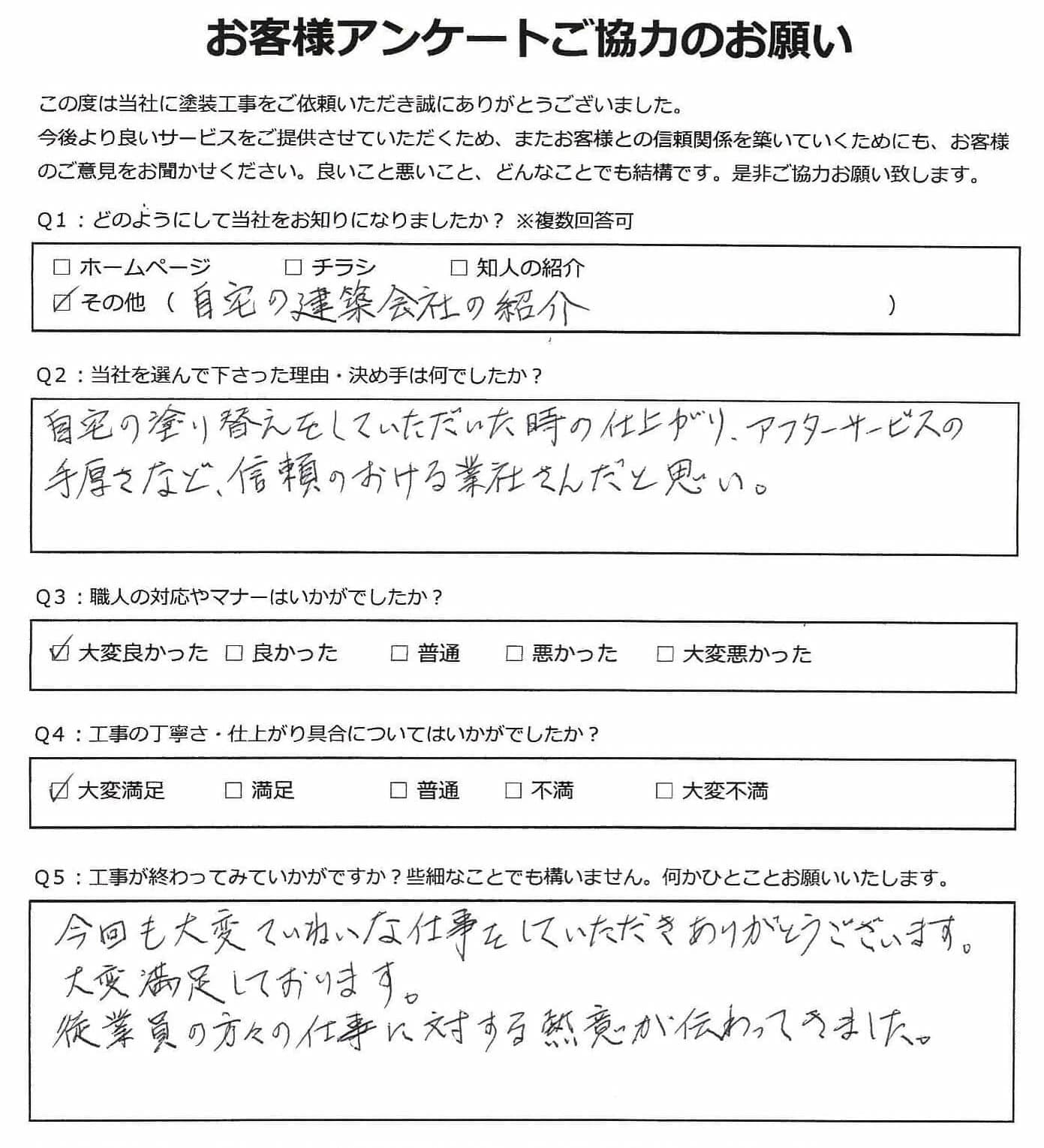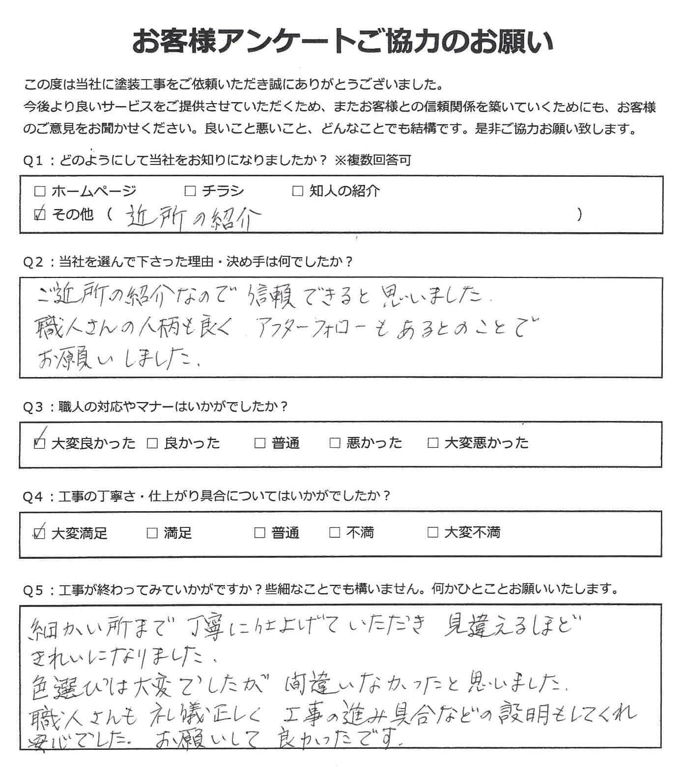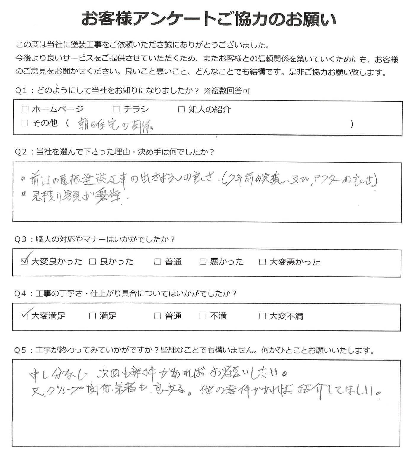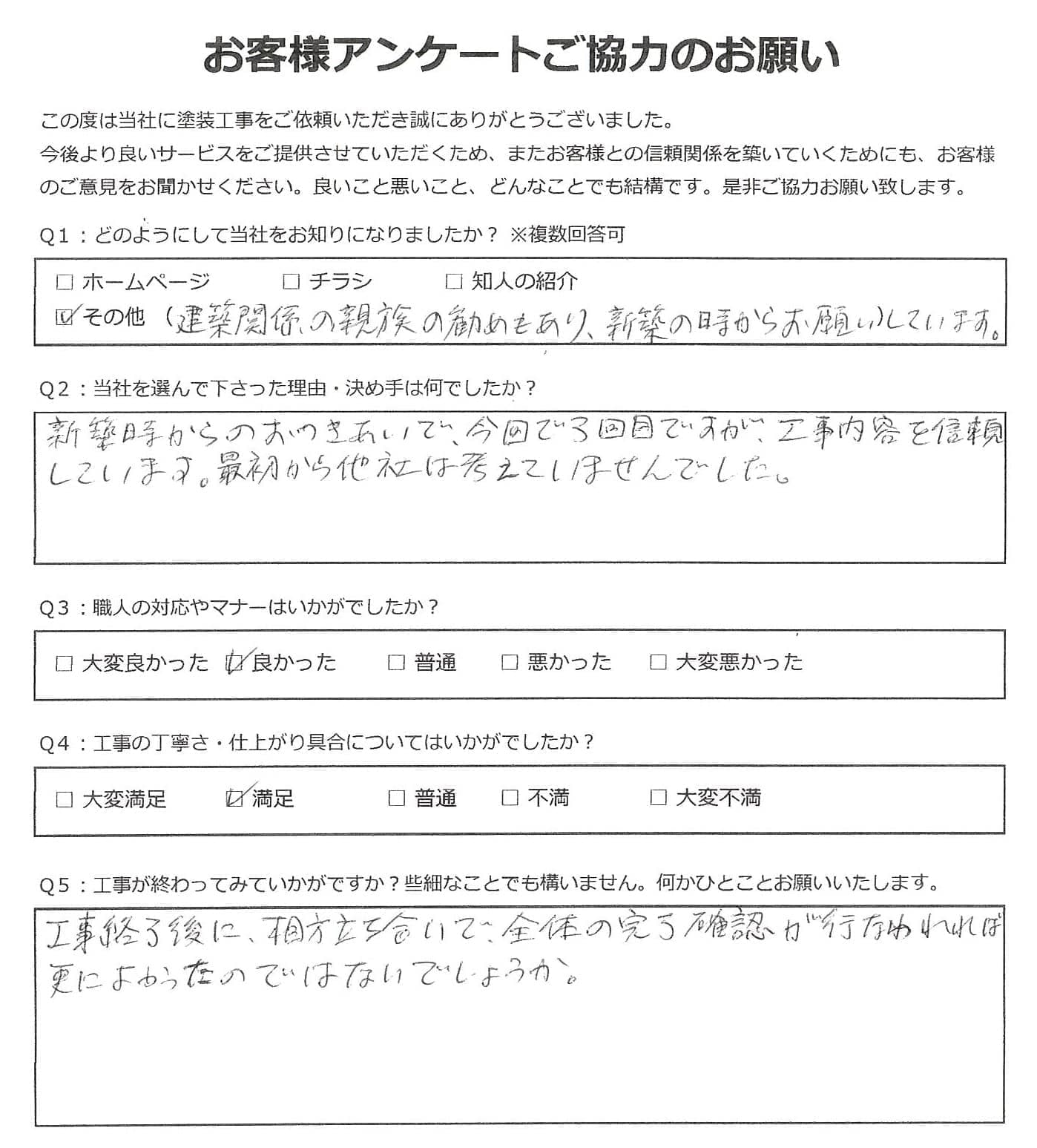 黒崎塗装店では施工後に必ずお客様アンケートを実施しております。 大変満足いただいたというお声から、中にはお叱り、厳しいご指摘など様々なお声をいただいております。